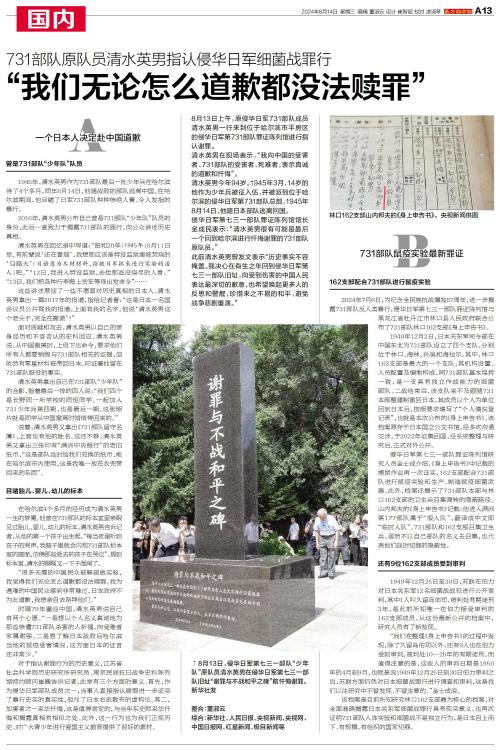 此前清水英男曾发文表示“历史事实不容掩盖。我决心在有生之年回到侵华日军第七三一部队旧址,向受到伤害的中国人民表达最深切的歉意,也希望唤起更多人的反思和警醒,珍惜来之不易的和平,避免战争悲剧重演。”