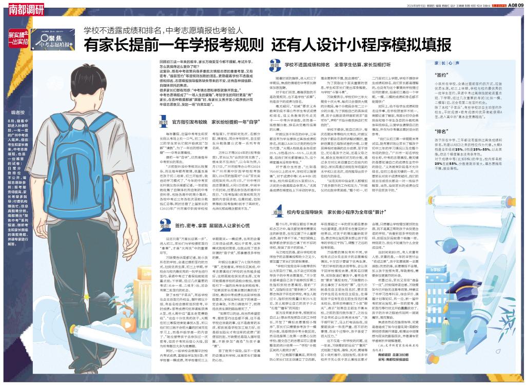 8月,随着中职进入补录阶段,一年一度的广州中考进入尾声。但在考生和家长看来,中考志愿填报,也是一份难答的试卷:日常分数排位不公开,填报志愿缺参照;报考服务待提高,家长希望多指导;付费机构赚钱忙,信息真假难分辨。南都推出“聚焦中考”系列报道,倾听考生和家长面临的填报难题,并请专家进行解答。