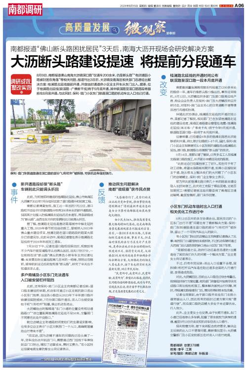 8月9日,南都报道佛山南海大沥镇滘口路“仅通车200余米,仍是断头路”“有店铺因小路被封困在角落”等相关问题。