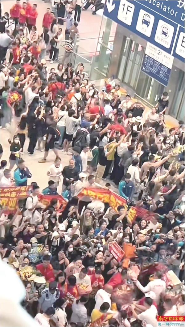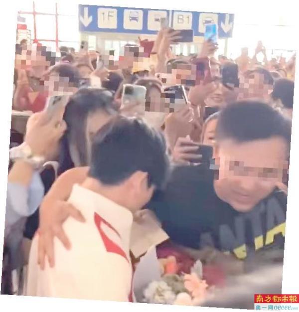前来接机的粉丝人头攒动,尽管有围栏限制和安保人员维持秩序,还是有不少人拿着手机、相机,冲出围栏追着运动员拍摄,前排的人甚至“怼脸”拍摄。现场闪光灯不断,运动员一行只能在拥挤人群中艰难前进。