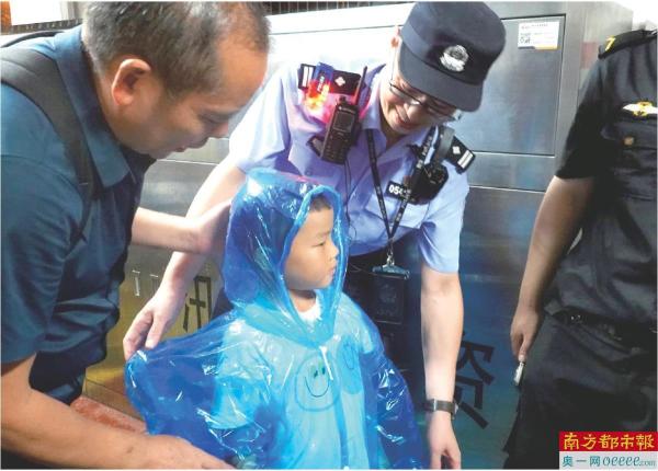 小男孩在民警帮助下穿上雨衣。 通讯员供图