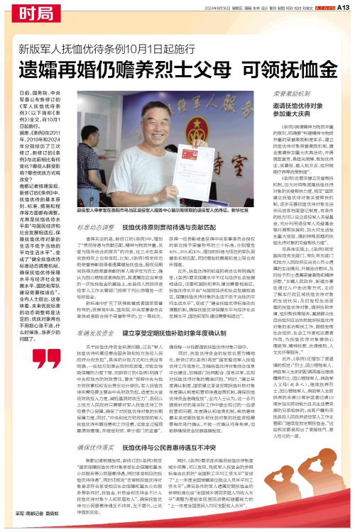 日前,国务院、中央军委公布新修订的《军人抚恤优待条例》全文,自10月1日起施行。