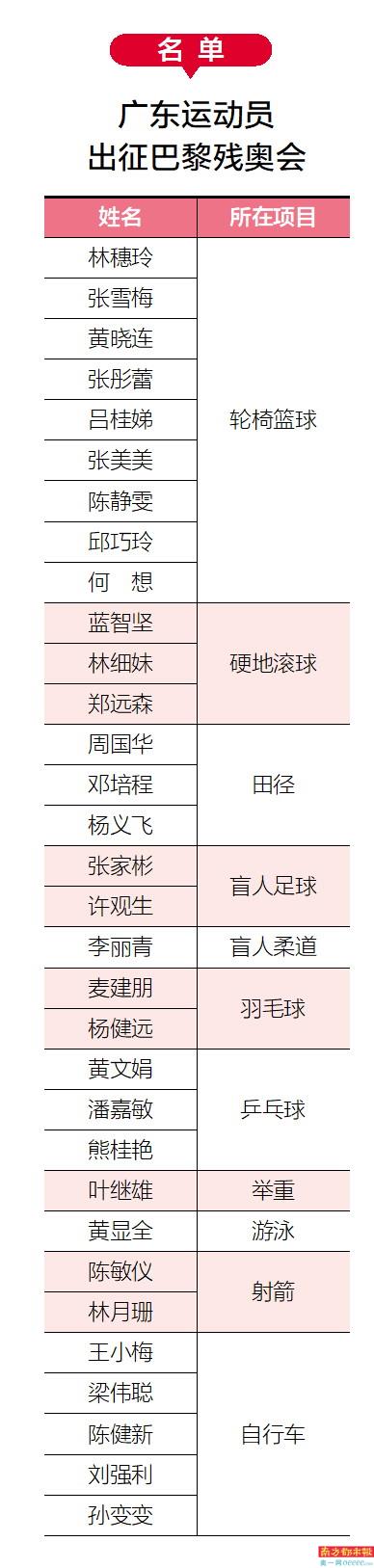参加本届残奥会的9名广州籍运动员分别是林穗玲、张雪梅、黄晓连、张美美、陈静雯、麦建朋、杨建远、郑远森、林细妹,他们将参加轮椅篮球、羽毛球、硬地滚球这三个项目的比赛。