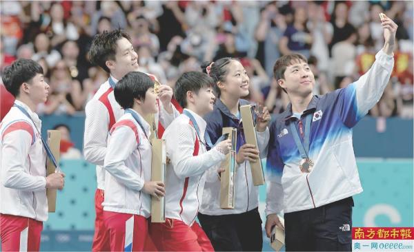 7月30日,巴黎奥运会乒乓球混双冠军、亚军和季军在颁奖仪式上用三星奥运定制版手机自拍。 新华社发
