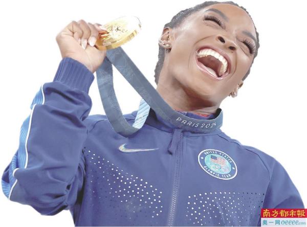 8月3日,身着耐克领奖服的美国体操明星拜尔斯在颁奖仪式上。新华社发