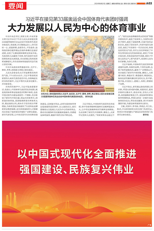 中共中央总书记、国家主席、中央军委主席习近平20日下午在人民大会堂接见第33届夏季奥林匹克运动会中国体育代表团全体成员。