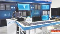 一个模拟的工厂货架场景里,多台乐聚公司的轮式人形机器人穿梭其中,完成货物的搬运。