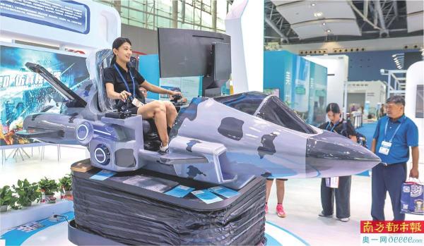 昨日,第32届广州博览会上,市民在体验歼20仿真模拟器。 南都记者 邹卫 武艺璇 摄