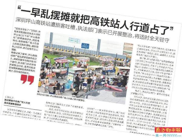 昨日,南都报道深圳坪山站(下称“坪山高铁站”)南广场外长期存在乱摆卖现象一事引发广泛关注。“深圳大件事”公众号稿件短时间内突破10万阅读量,国内各大媒体也积极转载该报道。据了解,南都报道后,坪山高铁站南、北广场内市容环境执法部门——龙岗区宝龙街道综合行政执法队迅速采取了相关行动,并在短时间内有效遏制了乱摆卖行为。