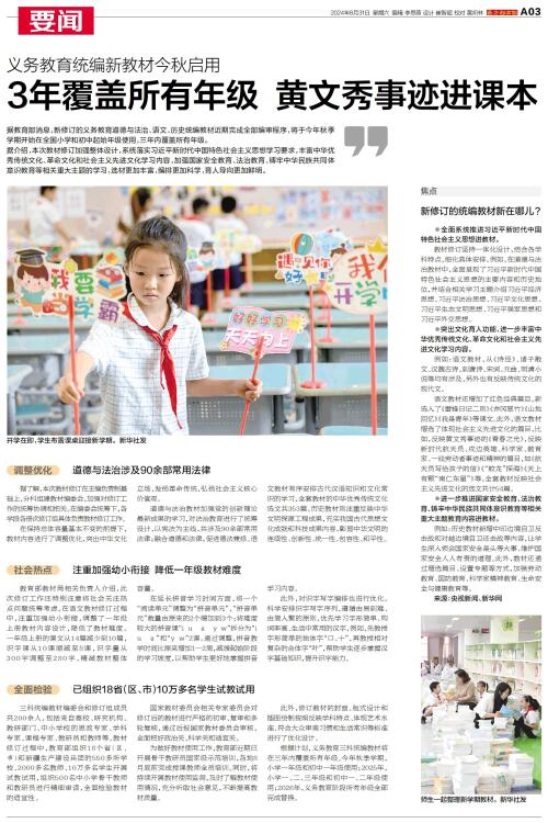 根据计划,义务教育三科统编教材将在三年内覆盖所有年级。今年秋季学期,小学一年级和初中一年级使用;2025年,小学一、二、三年级和初中一、二年级使用;2026年,义务教育阶段所有年级全部完成替换。