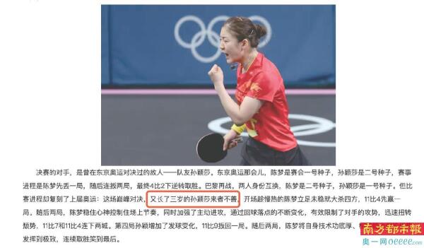 在描述决赛现场时,文章写道:“这场巅峰对决,又长了三岁的孙颖莎来者不善,开场趁慢热的陈梦立足未稳就大杀四方,11比4先赢一局。”