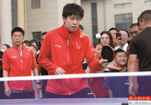 日前,在中国乒协主席刘国梁、国家队总教练李隼的带领下,国乒一行便走进甘肃庆阳的东湖公园,参加“国球进社区”“国球进公园”“国球进校园”活动。王楚钦、樊振东、王曼昱等球员与民间高手切磋的画面十分热闹,王楚钦甚至还笑言几个球友水平很高,“确实不好打”。而在前往甘肃省华池县南梁镇列宁学校时,孙颖莎和学生们“打成了一片”,她说:“非常开心来到南梁的列宁学校跟小朋友们交流球技,大家积极性非常高,非常开心看到这么多小朋友在学习乒乓球,热爱体育。”