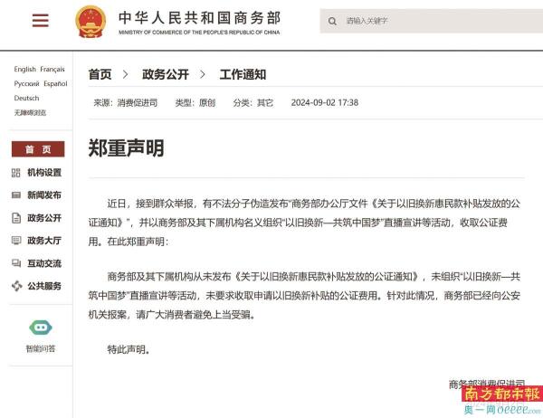 商务部声明称,近日,接到群众举报,有不法分子伪造发布“商务部办公厅文件《关于以旧换新惠民款补贴发放的公证通知》”,并以商务部及其下属机构名义组织“以旧换新—共筑中国梦”直播宣讲等活动,收取公证费。