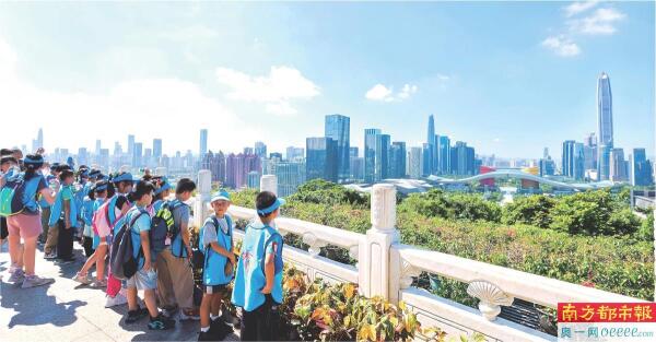 中小学生们站在莲花山山顶广场,俯瞰整个市民中心。