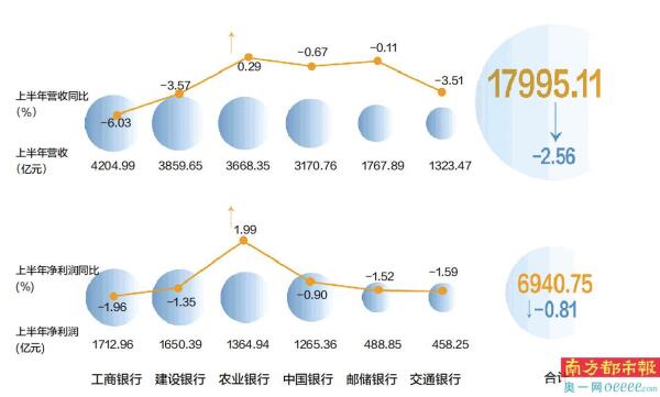wind数据显示,上半年六大国有行实现营收合计17995.11亿元,同比下滑2.56%,下滑幅度较一季度扩大0.34个百分点;净利润合计6940.75亿元,同比下滑0.81%,下滑幅度较一季度缩窄1.38个百分点。上半年六大国有行营收增速较一季度进一步下行,净利润增速较一季度有所改善。