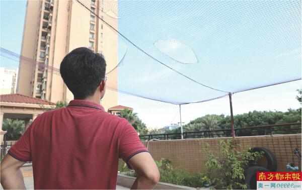 廖先生自家花园里拉起的防护网已被碎石砸出数个大窟窿。