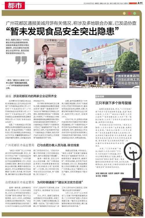 昨日,南都记者从广州市花都区市场监督管理局获悉,该局发布美诚月饼有关情况通报称,涉及花都区内的两家企业证照齐全,截至目前暂未发现存在违法行为。