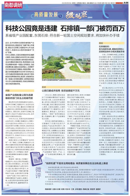 针对上述情况,日前石排镇政府回应南都记者称,科技公园有约4000平方米土地因当时不符合石排镇原土地利用总体规划,无法办理相关用地手续。考虑到相关土地符合调整中的新一轮国土空间规划,为抢抓发展机遇、提振企业投资信心,石排镇于2023年启动该工程建设。但因东莞新一轮国土空间规划数据于2024年1月中旬才正式作为建设项目报批依据,因此该工程未能及时完善用地手续。其还称,该地块符合新一轮国土空间规划要求,按照相关规定可以予以没收保留使用,后续石排镇将加快补办相关用地手续。