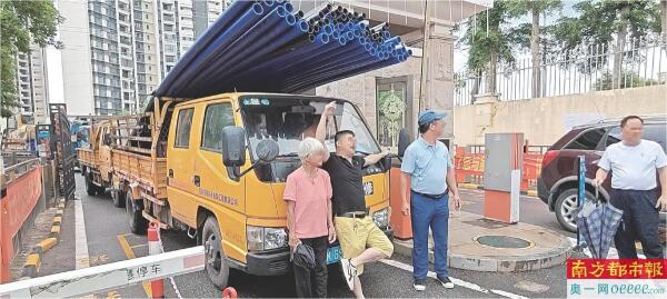 7月4日,粤海水务准备施工时,反对换水业主携白发老人拦截施工车辆。