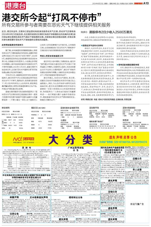 今年6月18日,香港特区政府行政长官李家超表示,港交所将于9月23日起实施证券市场在恶劣天气下不停市,维持运作。投资者在新安排下,可以在8号风球及以上台风讯号,甚至黑色暴雨警告期间,照常买卖香港股票及衍生产品,并透过沪深股通买卖A股等。