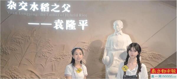主播(右)与讲解员带领线上观众参观隆平水稻博物馆。 (直播截图)
