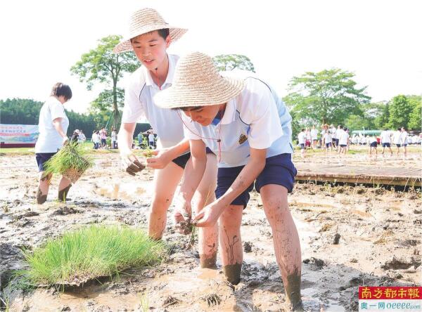 近日,中山市迪茵公学生态园秋耕启动,1000多名高一学子下田插秧。
