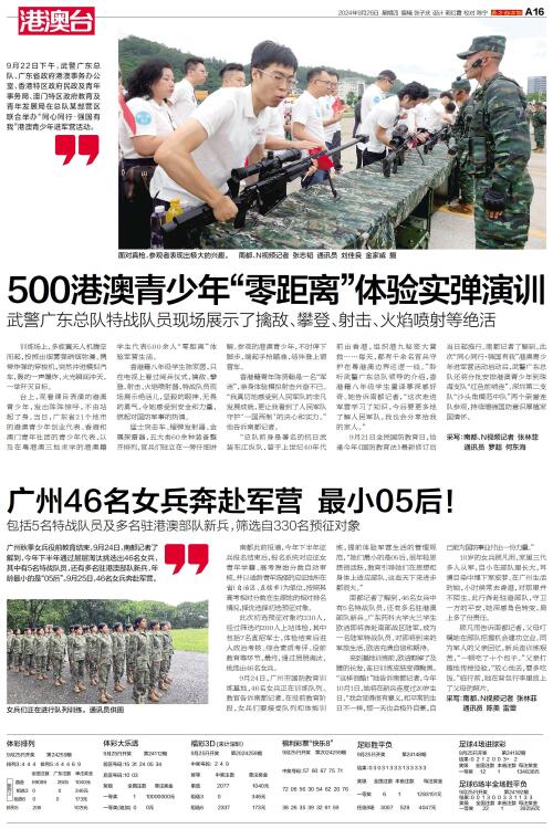 9月22日下午,武警广东总队、广东省政府港澳事务办公室、香港特区政府民政及青年事务局、澳门特区政府教育及青年发展局在总队某部营区联合举办“同心同行·强国有我”港澳青少年进军营活动。