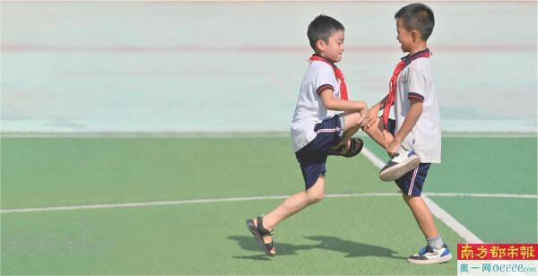 9月20日,广西梧州市长洲区龙平小学,学生们在阳光大课间进行斗驹比赛。 新华社发