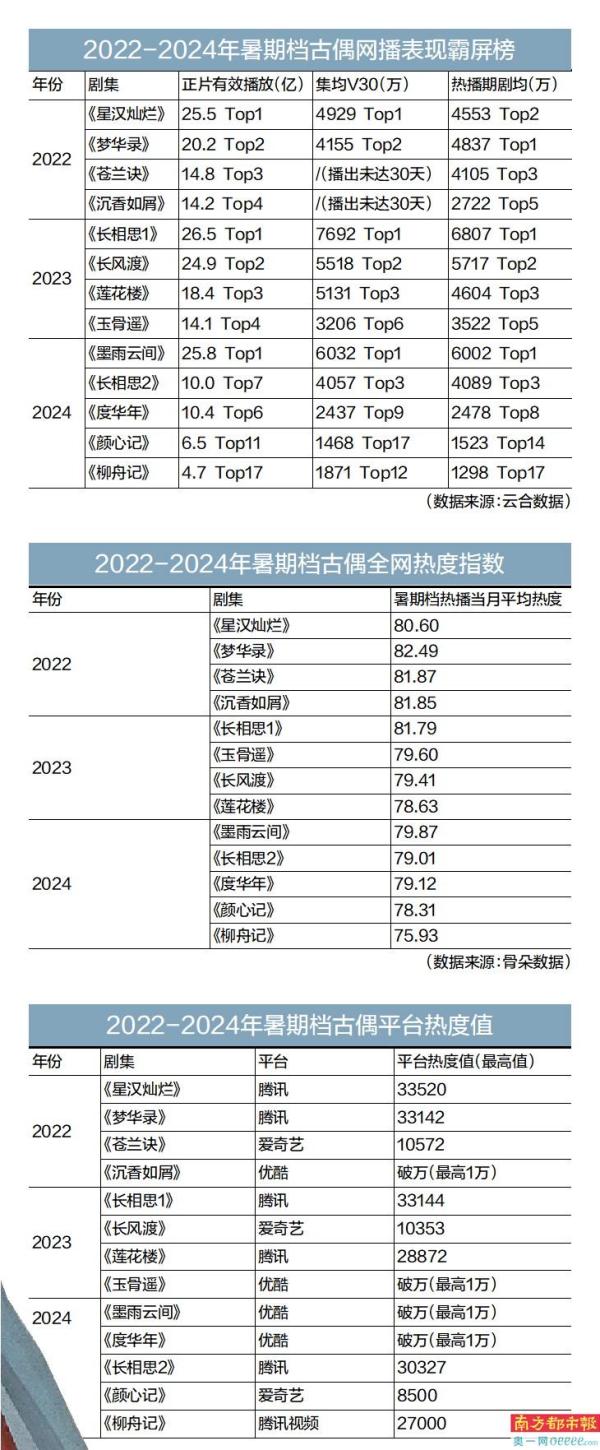 反观2024年刚结束的暑期档,各类数据榜单中,古偶剧的成绩不再那么亮眼和突出了。云合数据发布的2024暑期档剧集网播表现霸屏榜中,正片有效播放除了《墨雨云间》遥遥领先,有效播放达25.8亿,在古偶里排第二的《度华年》有效播放直接腰斩到只有10.4亿,《长相思第二季》同获10亿有效播放;集均V30榜和热播期集均榜中前10名仅有《墨雨云间》《长相思第二季》《度华年》三部,且并未能均位于榜单的前三名。收视热度下降之外,2024年暑期档古偶剧的得分也不如人意。以豆瓣评分为例,热度最高的《墨雨云间》评分6.6,其他古偶剧的评分也基本在及格线徘徊:《四海重明》6.3分,《度华年》6.2分,《长相思第二季》5.9分,《颜心记》5.9分,最佳成绩的《柳舟记》评分也从8分跌到了7.8分。