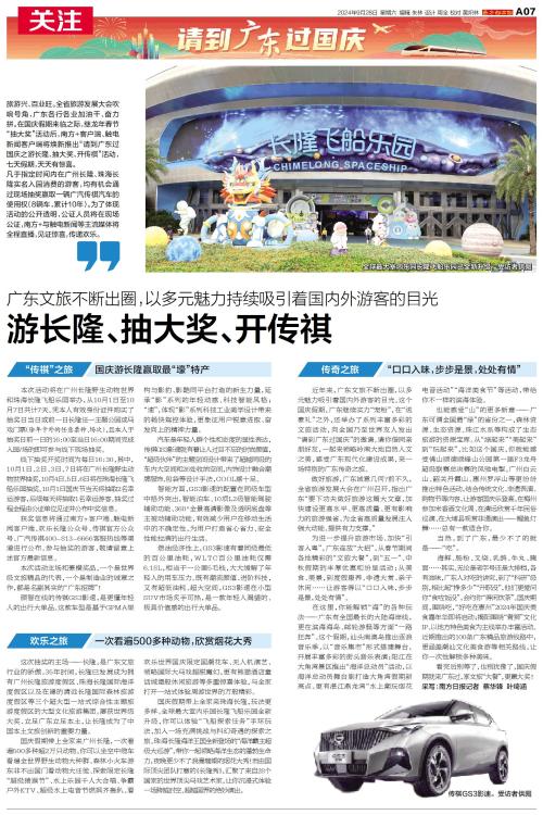 近年来,广东文旅不断出圈,以多元魅力吸引着国内外游客的目光。这个国庆假期,广东继续实力“宠粉”,在“送豪礼”之外,还举办了系列丰富多彩的文旅活动,向全国乃至世界友人发出“请到广东过国庆”的邀请。请你偕同亲朋好友,一起来领略岭南大地自然人文之美,感受广东现代化建设成果,来一场特别的广东传奇之旅。