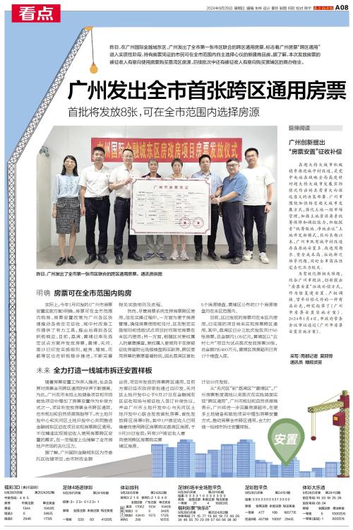 昨日,在广州国际金融城东区,广州发出了全市第一张市区联合的跨区通用房票,标志着广州房票“跨区通用”进入实质性阶段,持有房票凭证的市民可在全市范围内自主选择心仪的新建商品房。