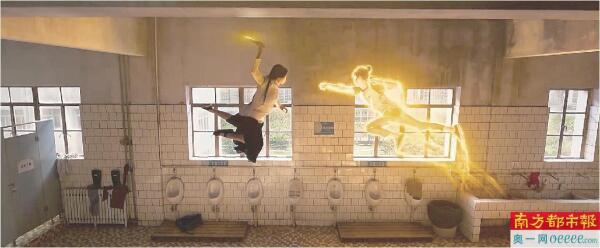 在画面呈现效果上,黄烁团队也进行了不少细节上的创意处理。在影片的打斗镜头中,他们会使用一些漫画拟声字来削弱暴力感。例如在墓地中冯宝宝用铁锹打张楚岚的头,在打击瞬间,屏幕上出现漫画拟声字“砰”来取代真实画面,配以卡通打击音效,在减弱暴力感的同时,也能更好地还原其漫画感。
