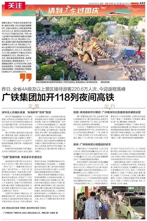 南都记者从广东省文化和旅游厅获悉:据初步测算,2024年国庆假期第6天,全省4A级及以上景区接待游客220.6万人次。