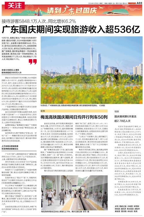 10月7日,南都记者从广东省文化和旅游厅获悉:据初步测算,2024年国庆假期(10月1日至7日),全省累计接待游客5848.1万人次,按可比口径同比增长6.2%。实现旅游收入536.9亿元,按可比口径同比增长8.9%。据广铁集团,国庆黄金周最后一天迎来客流返程高峰,客流较之前一天有明显增长,当天发送旅客277.2万人次,同比增加27.7万人次,同比增长11.1%。