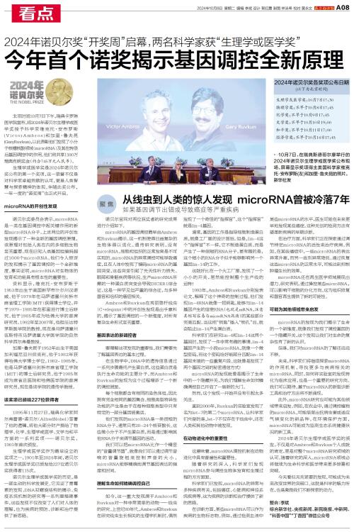 瑞典卡罗琳医学院宣布,将2024年诺贝尔生理学或医学奖授予科学家维克托·安布罗斯(VictorAmbros)和加里·鲁夫昆(GaryRuvkun),以此表彰他们发现了小分子核糖核酸领域(microRN