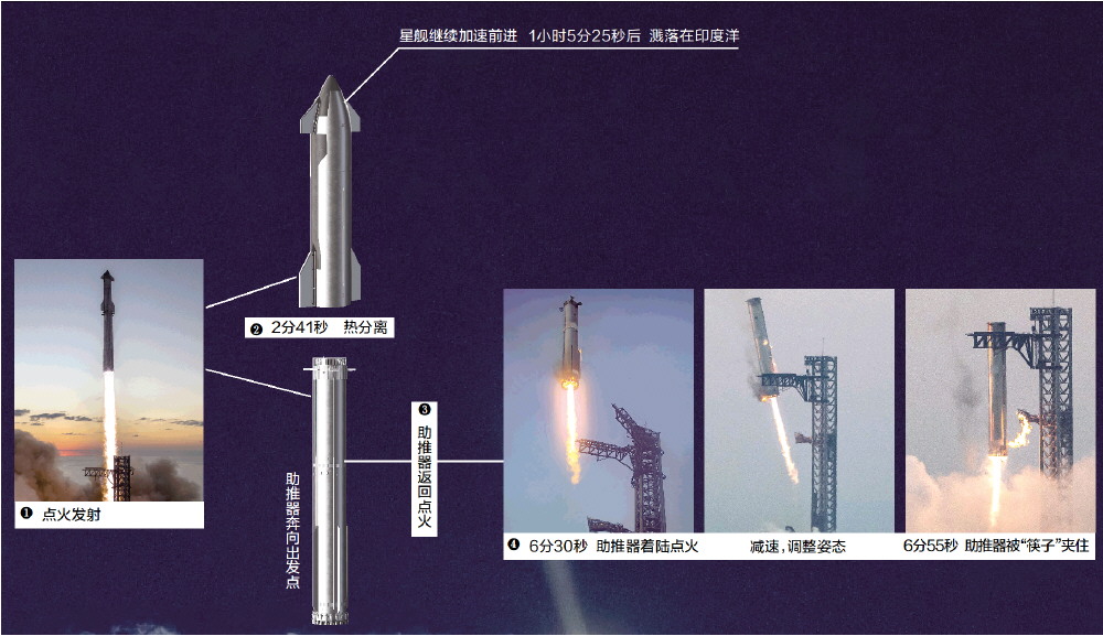 2024年10月13日第五次试飞,历史性地实现了火箭一级助推器的半空捕获回收。