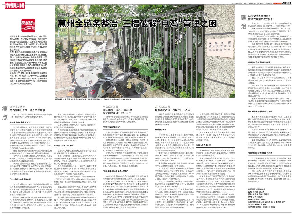 日前,南都记者针对惠州电动自行车火灾安全隐患问题展开调研,通过实地走访、线上调查,回访过往电动自行车失火典型案例现场,全面扫描惠州电动自行车火灾安全隐患问题,总结整改、整治经验,以提升惠州电动自行车车主安全使用意识,完善电动自行车管理措施,减少乃至避免电动自行车火灾安全事故发生,促进社会和谐稳定,共建平安惠州。