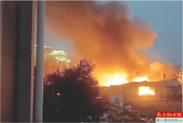 另一位王圩村村民向南都记者发来现场视频,画面中房屋燃起熊熊大火,并伴有鸡鸣和犬吠。该村民告诉南都记者,“我早上听到消防车的声音就起来了,看到后面家具厂起火了”。