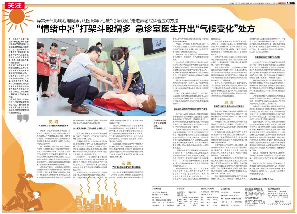 意识到气候变化与健康的紧密关联后,工作了16年的医生卢辉开始重新审视自己的职责,成为一名致力于科普如何应对气候变化的志愿者。这些年,他走进养老院,为老人们办科普讲座,为气候变化之下最容易受到冲击的脆弱人群讲解应对方法。卢辉的工作逐渐被外界知晓并引起媒体关注。