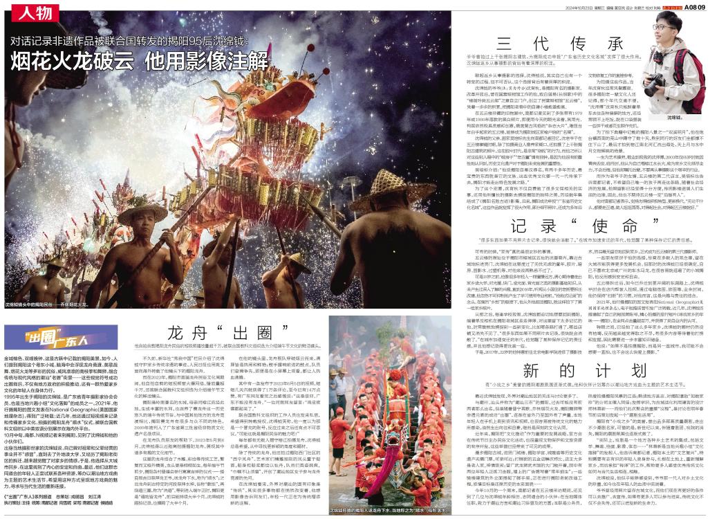不久前,新华社“秀我中国”栏目介绍了沈绵钺守护家乡传统非遗的事迹,人民日报也用英文面向海外转载了他镜头下的揭阳龙舟。