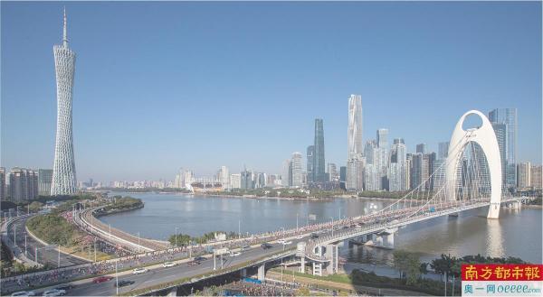 参加广马的选手跑过猎德大桥。体育赛事就是广州一张亮丽的城市名片。 南都记者 黎湛均 摄
