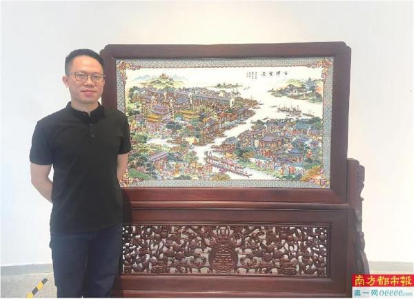 周承杰说,这个作品主要是反映古时候大湾区的繁华景象,就是以广州为主,辐射澳门、香港。里面有我们熟识的十三行、六榕塔、光孝寺等。从创作构思到完成,花了两年时间。