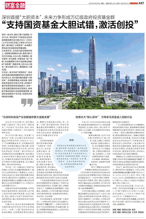 10月24日,深圳发布了《促进创业投资高质量发展行动方案(2024—2026)(公开征求意见稿)》,首次提出“大胆资本”,未来要力争形成万亿级政府投资基金群。