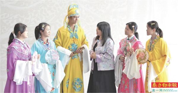 “设计、画图、印图、刺绣、裁剪、车缝、钉珠……一件传统戏服的制作,需要通过十多道工序来完成,一般需要一年时间。”这次,何凤婷还带来几套戏服让少年们试穿,扮演一回“小生”和“花旦”。