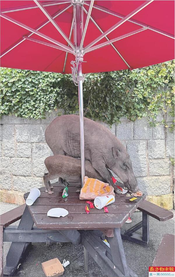社交媒体上,多位网友晒出自己在香港街头以及太平山、浪茄湾等知名景点偶遇野猪的照片和视频。更有网友发文直呼“避雷香港海洋公园里会抢午饭的野猪”,在其发布的照片中,两只野猪站在桌子上埋头吃薯条,桌面上散落着麦当劳包装袋、杯子,一片狼藉。
