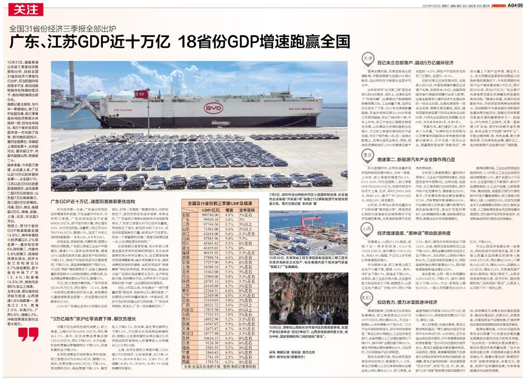 10月31日,随着青海公布前三季度经济数据和分析,目前全国31省份经济三季报均已出炉。