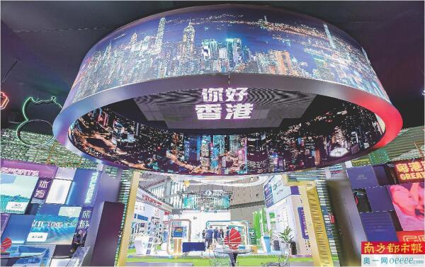 香港旅发局的2024年展台以“下一站香港”为题,巨大的椭圆形展位设计充满高端科技感,巨大环形LED电子显示屏幕全方位展示香港文化、体育及旅游发展的多元风貌,引人入胜。