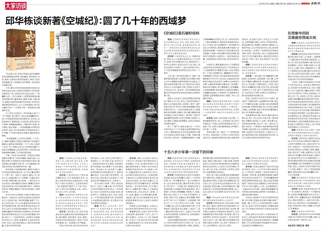邱华栋:很多年来,我都在北京生活,所写下的作品大都是当代题材的、以城市为背景的小说。当我已经写了30多年,我就进入一种自觉的写作状态,我开始对西域出土的锦帛、简牍、雕塑、绘画、音乐有了兴趣。我意识到,古代西域和当代新疆在召唤我回望,我意识到,西域的历史文化太丰富和复杂了,探寻沉默的档案与考古发掘出来的器物非常重要,而文学想象赋予它立体的形象。因此,《空城纪》的写作探索对我个人而言,是圆了一场几十年的西域新疆梦,是我给我的出生地新疆献上的一个宏大的故事。