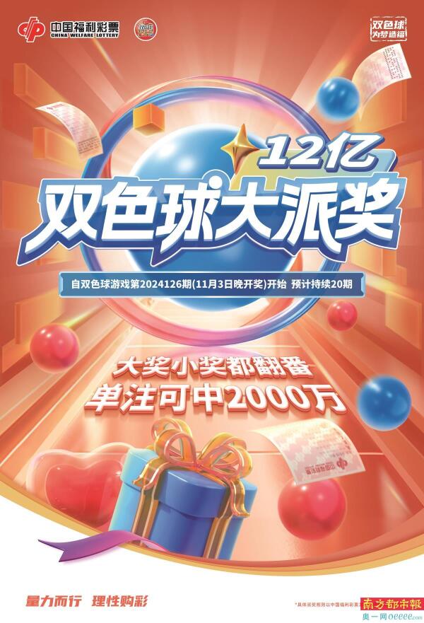 为回馈广大购彩者对中国福利彩票的关心和支持,中国福利彩票发行管理中心决定自双色球游戏第2024126期(2024年11月3日晚开奖)开始,开展总奖金为12亿元的2024年双色球游戏派奖活动。活动预计持续20期,所需资金合计约12亿元,从双色球游戏调节基金支出。
