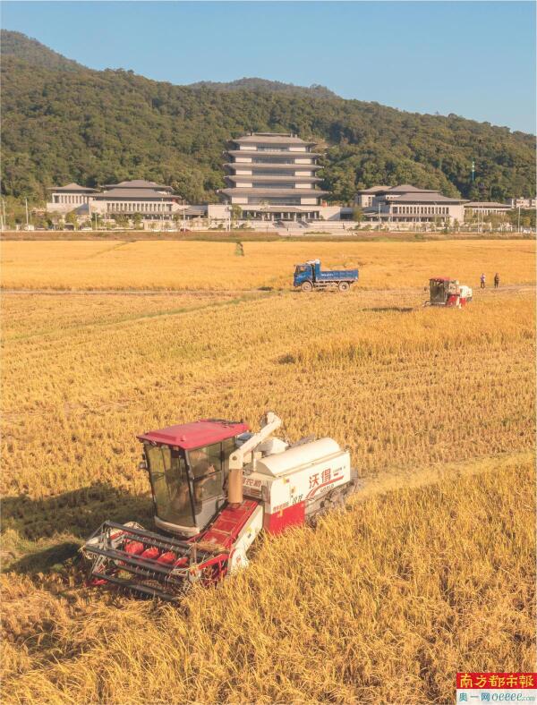 近日,位于广州市从化区的广州国家版本馆前约140亩稻田开镰收割,预计晚稻亩产可达1000斤以上。 南都拍客 黄北辉 摄